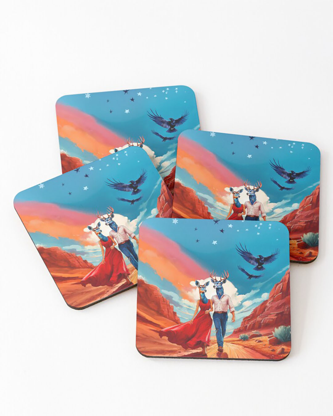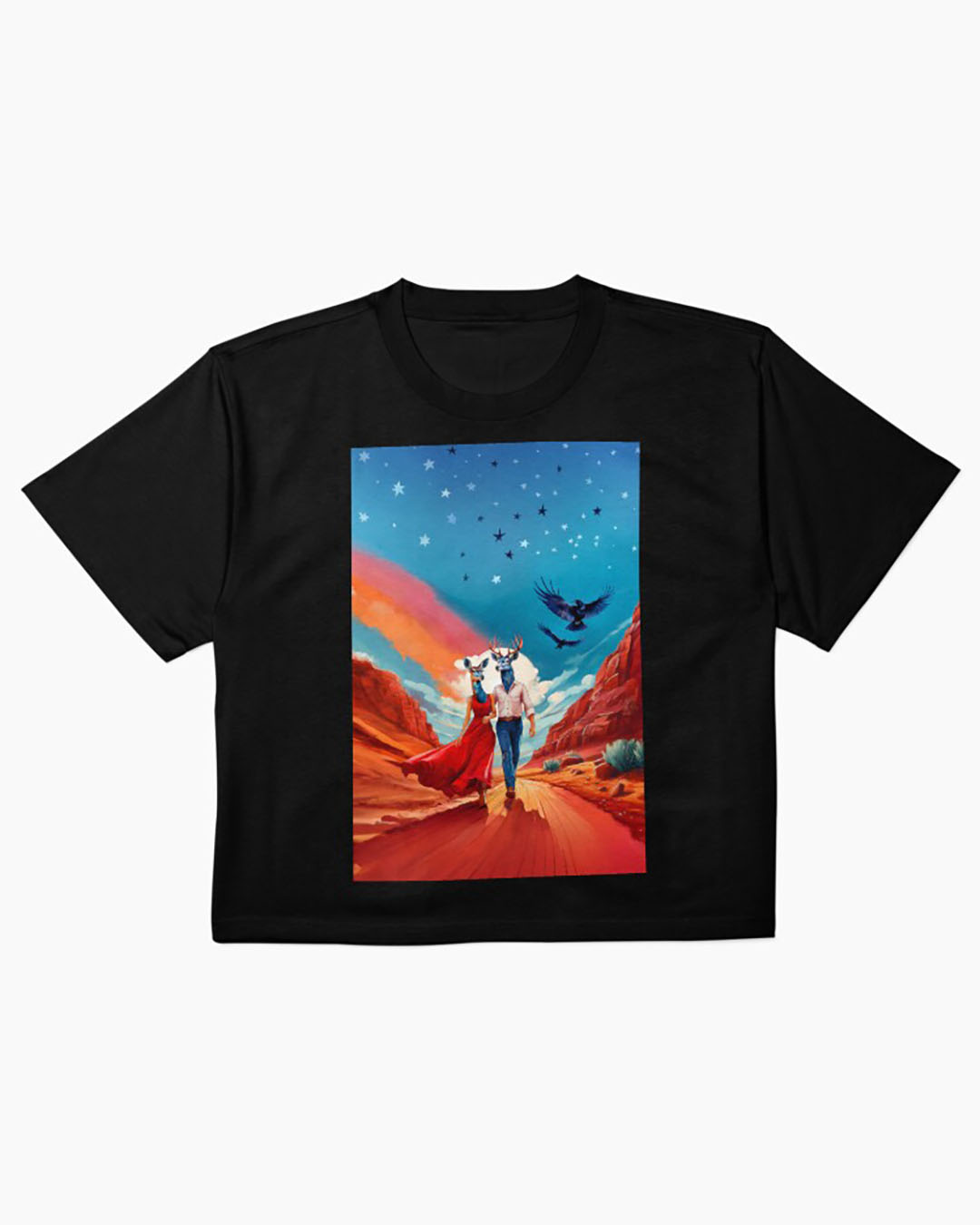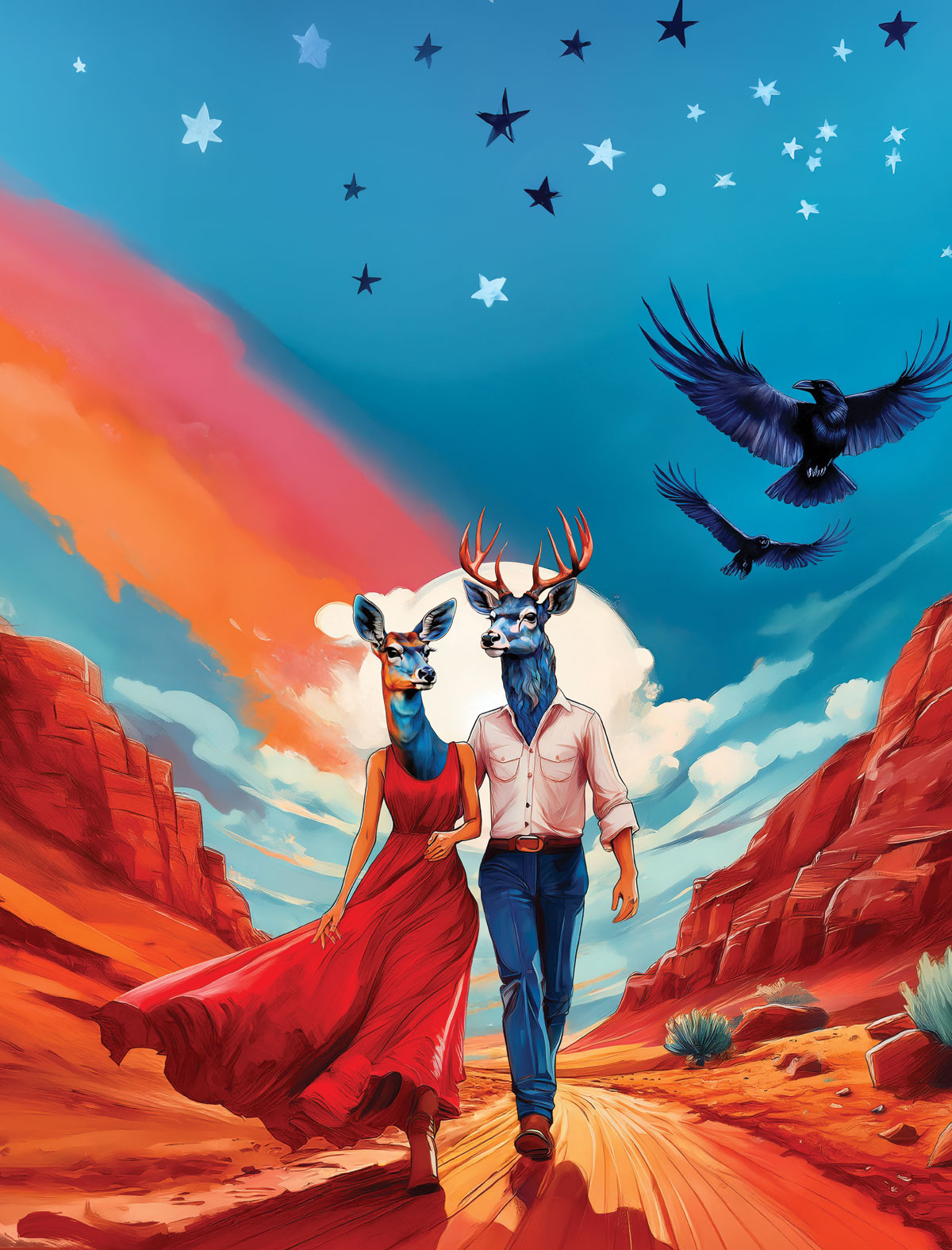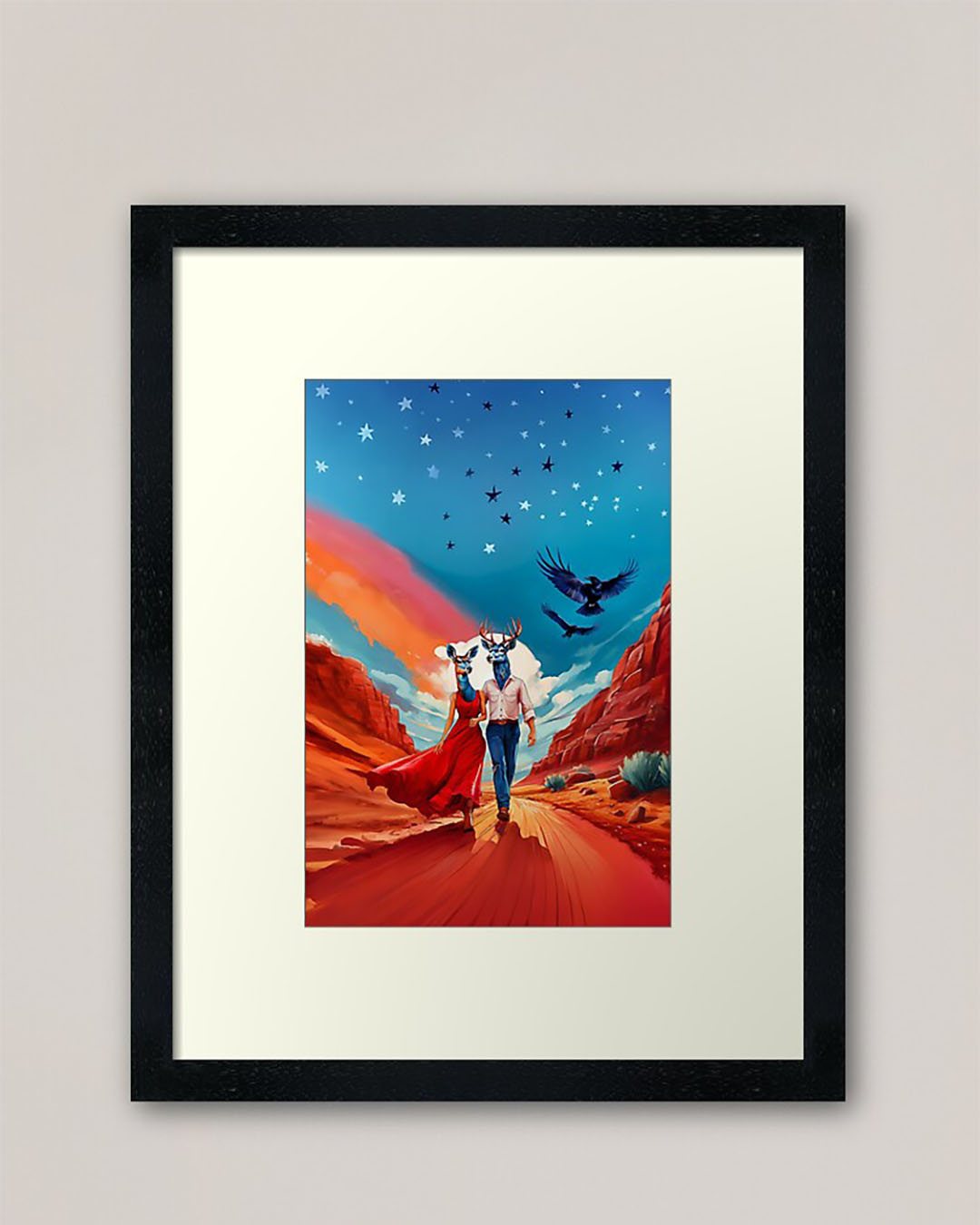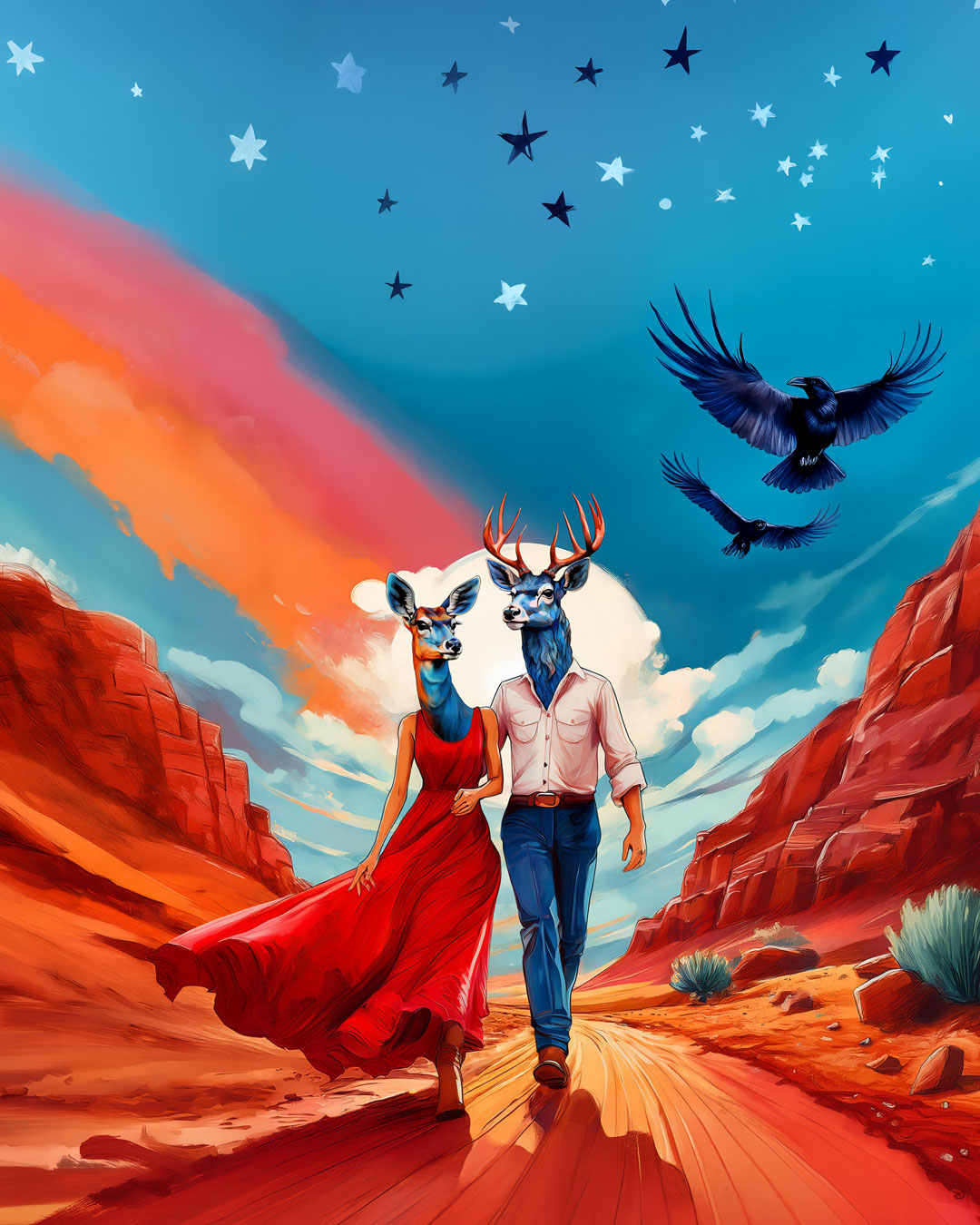 “Walk In Beauty” is the artwork showcased here. Two blue deer walk side by side down a red dirt road through a desert canyon, symbolizing a sacred way of life. The man, dressed in rugged cowboy attire, and the woman, in a flowing red gown, blend elegance and strength as ravens soar above—guides of transformation and spirit. With stars above a white setting sun, this scene honors the sacred “red road” of purpose, respect, and reverence for the natural world.