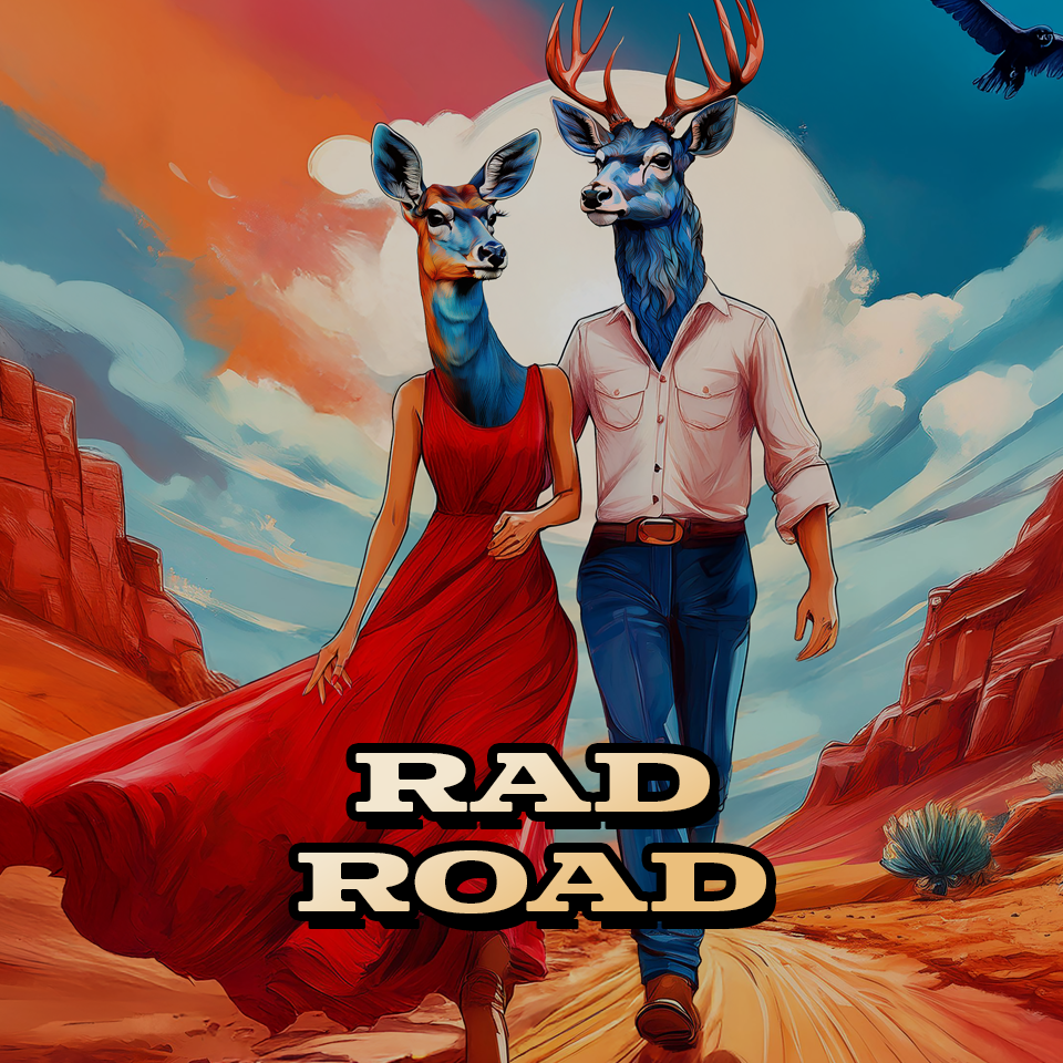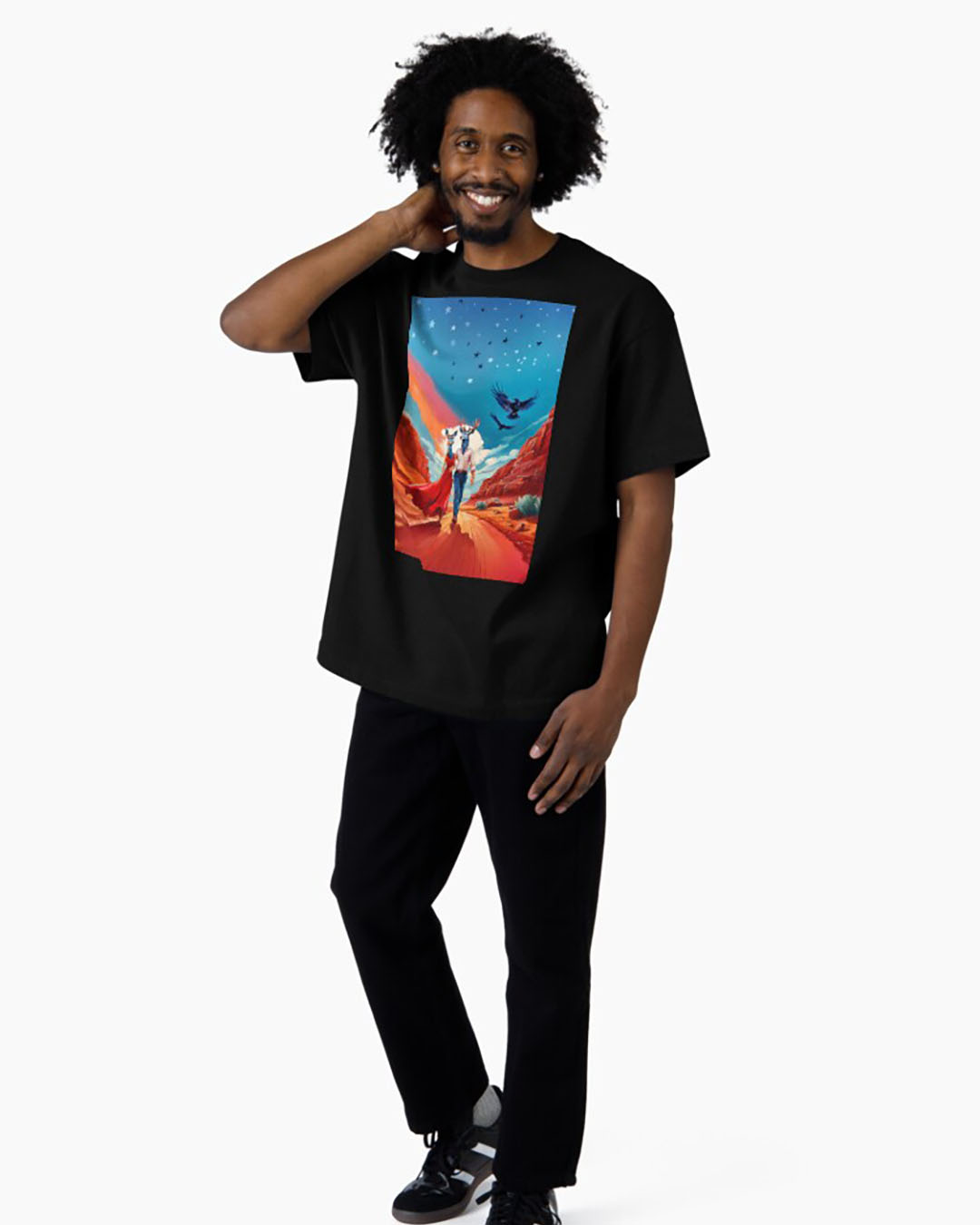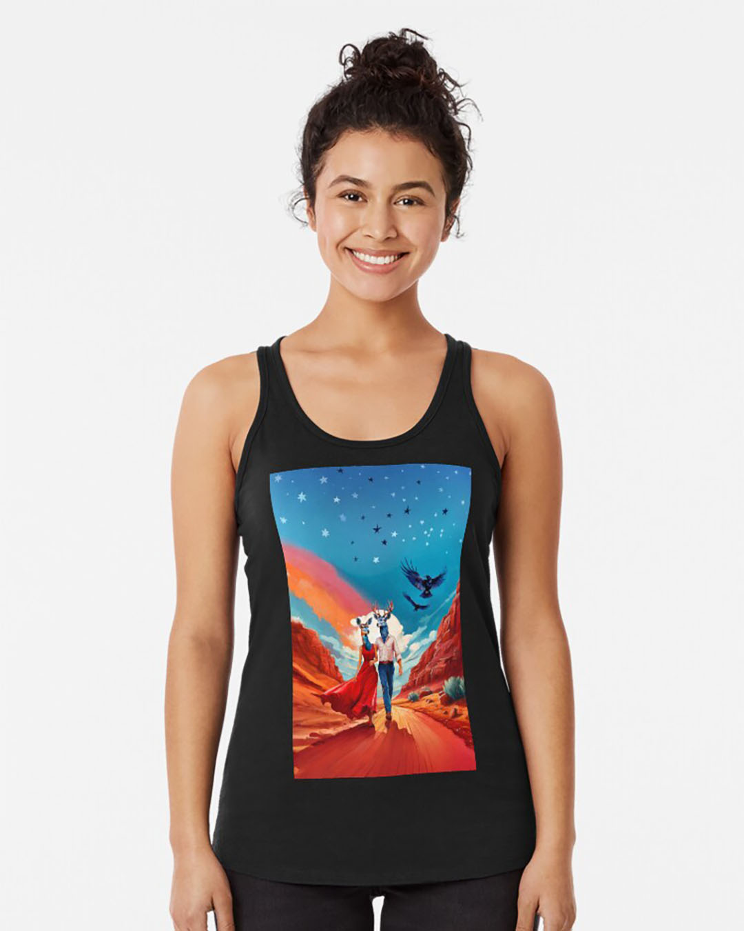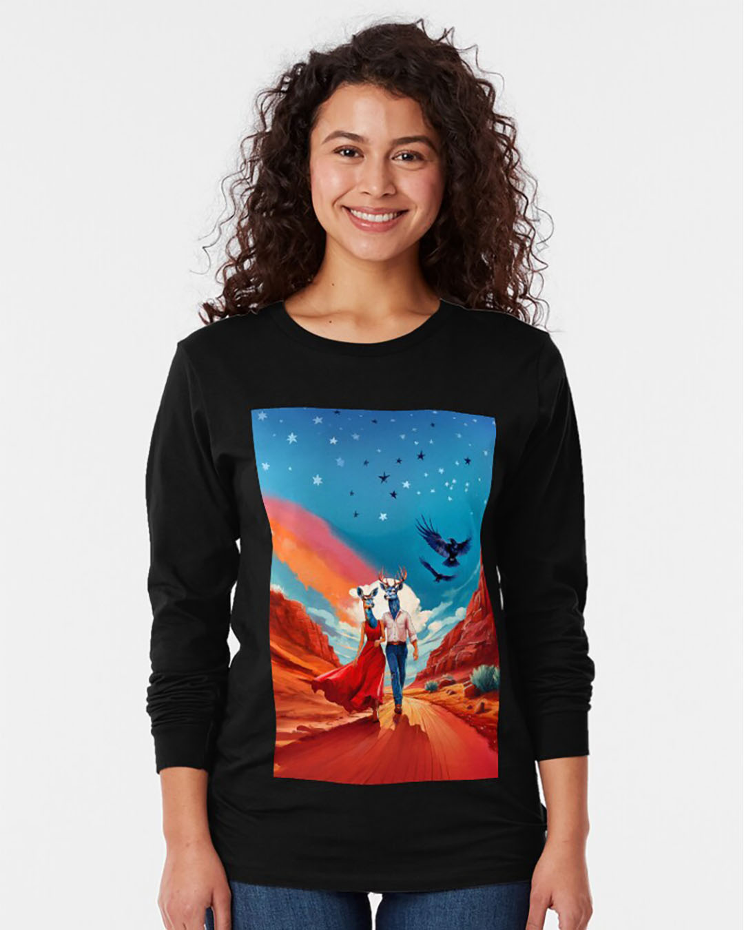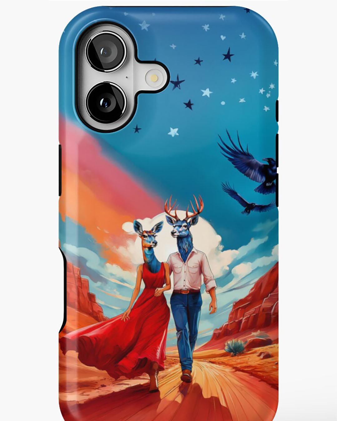 “Walk In Beauty” is the artwork showcased here. Two blue deer walk side by side down a red dirt road through a desert canyon, symbolizing a sacred way of life. The man, dressed in rugged cowboy attire, and the woman, in a flowing red gown, blend elegance and strength as ravens soar above—guides of transformation and spirit. With stars above a white setting sun, this scene honors the sacred “red road” of purpose, respect, and reverence for the natural world.