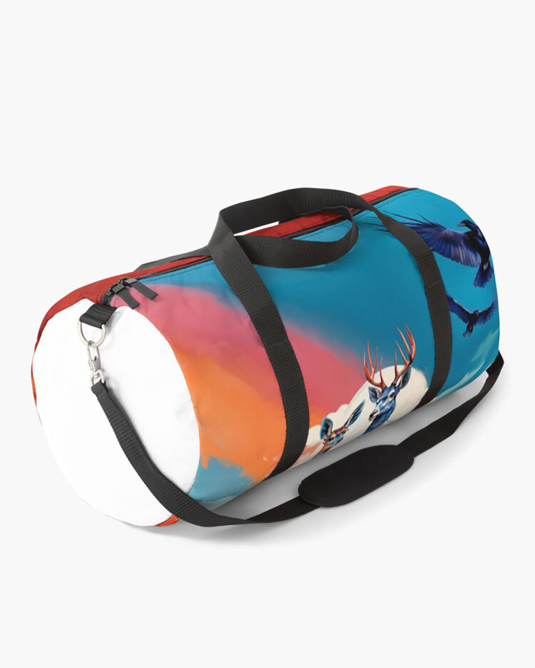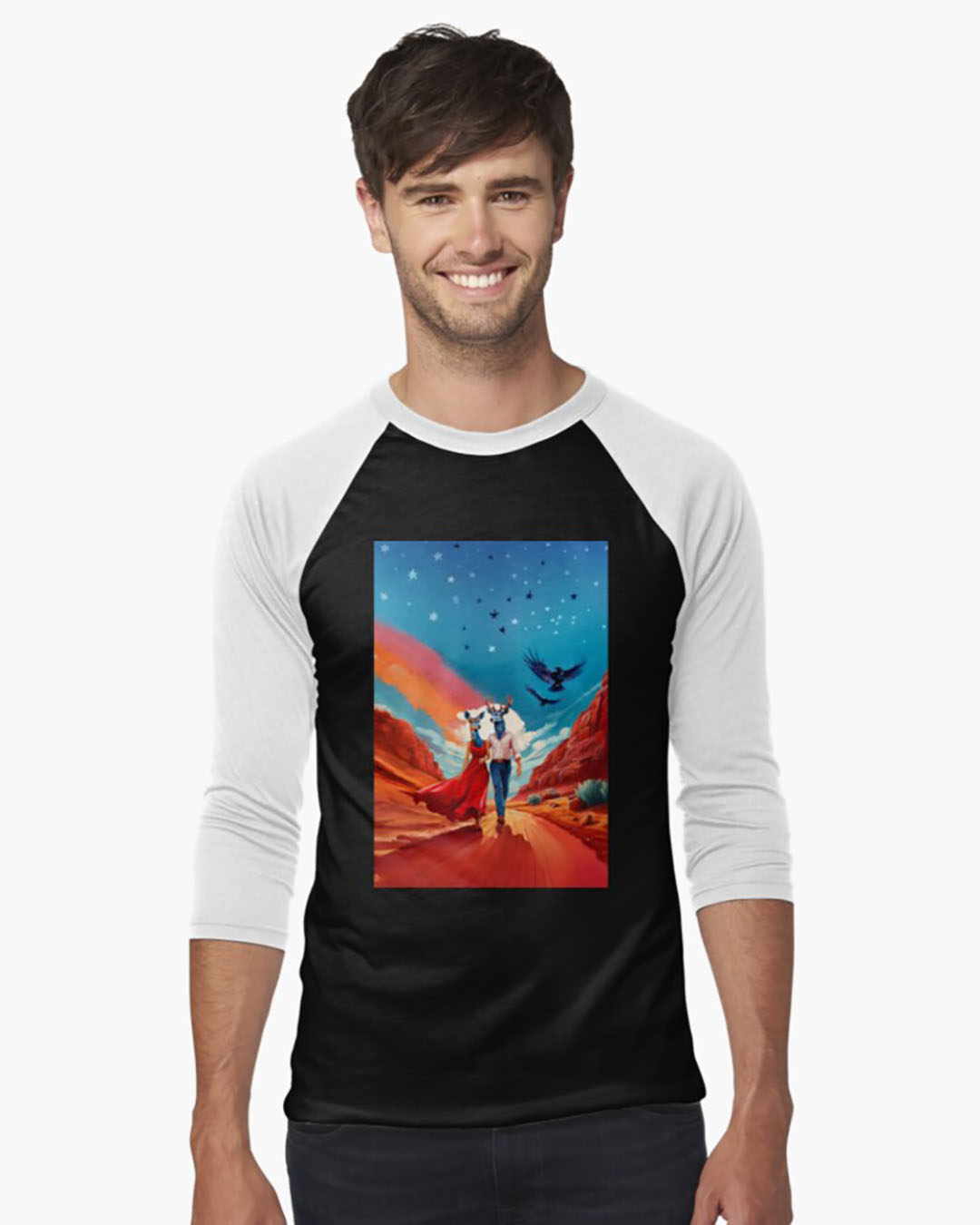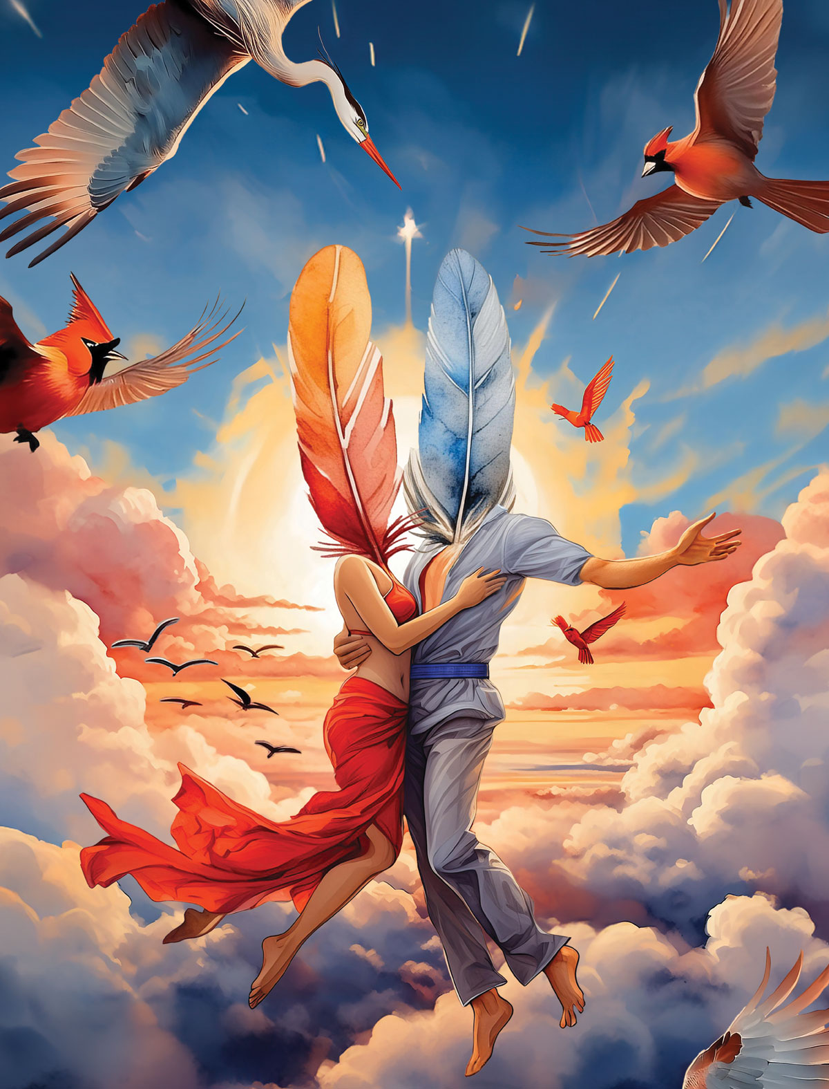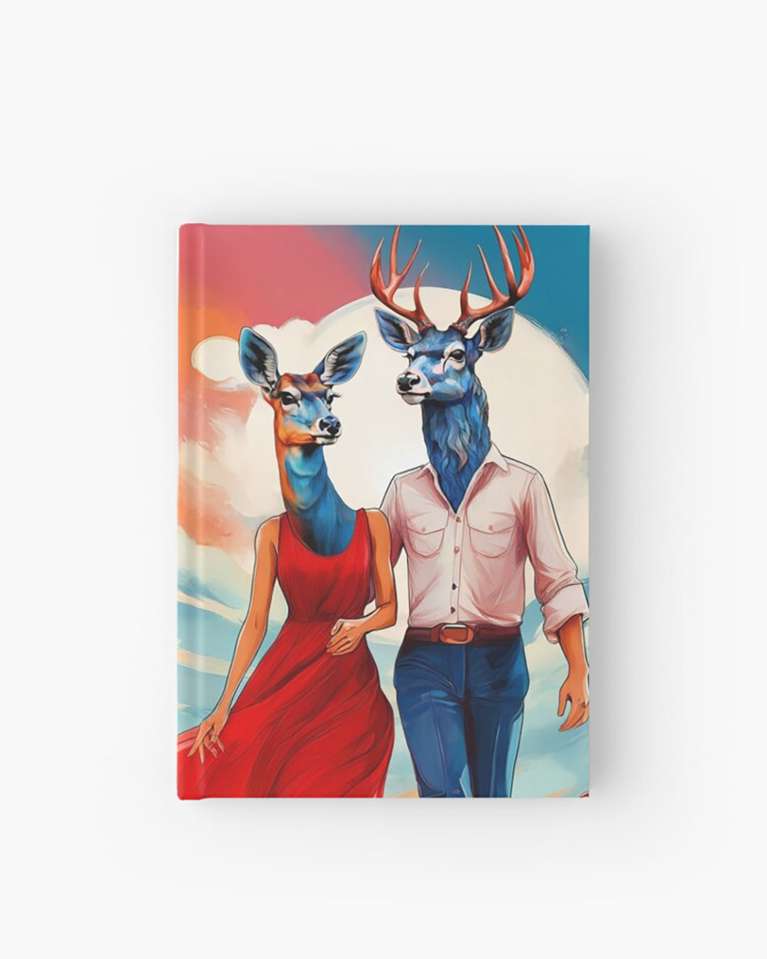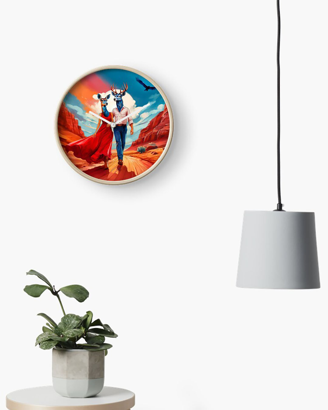“Walk In Beauty” is the artwork showcased here. Two blue deer walk side by side down a red dirt road through a desert canyon, symbolizing a sacred way of life. The man, dressed in rugged cowboy attire, and the woman, in a flowing red gown, blend elegance and strength as ravens soar above—guides of transformation and spirit. With stars above a white setting sun, this scene honors the sacred “red road” of purpose, respect, and reverence for the natural world.